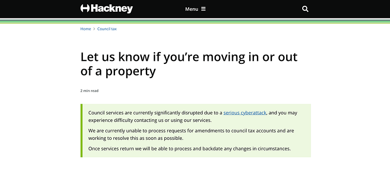 Finally I found where I needed to go and was immediately stopped by a big green box declaring a disruption due to a serious cyberattack…