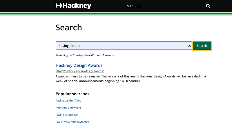 Perfect click on that link which takes me to Hackney main website. I simply type in Moving Abroad as per Gov.uk website to be shown.. not a lot..