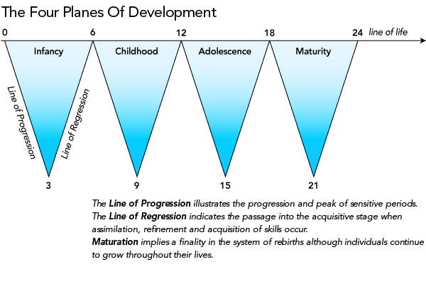 Described below is ‘The Four Planes of Development’ which is the philosophy behind everything Montessori does and based on the ‘baking a cake’ metaphor above. Within each stage there is a line of progression which ends with a peak of sensitive periods, followed by a line of regression which includes refinement and acquisition of skills.