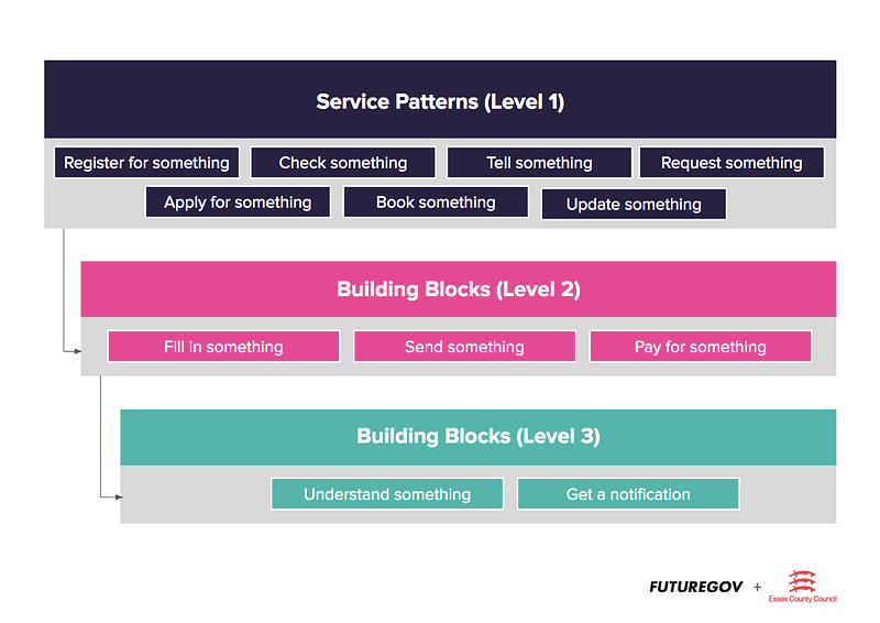 Looking back at Brad Frost Atomic design principles, the same can be put into place for service patterns. This was identified by essex.gov.uk where they are experiment with the level of building blocks needed to create a service pattern:
