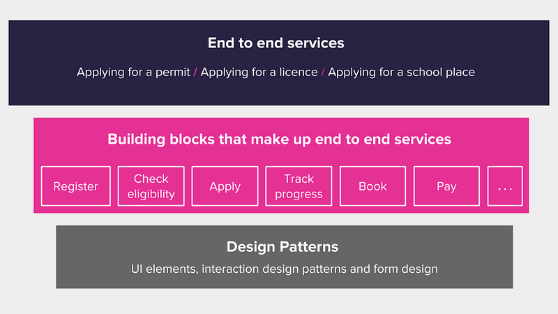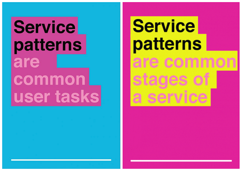 If we look at Service Patterns, which are described as sets of practical guidelines for building a service (or bits of services) that are repeated across something like getting a licence or exchanging the ownership of something.