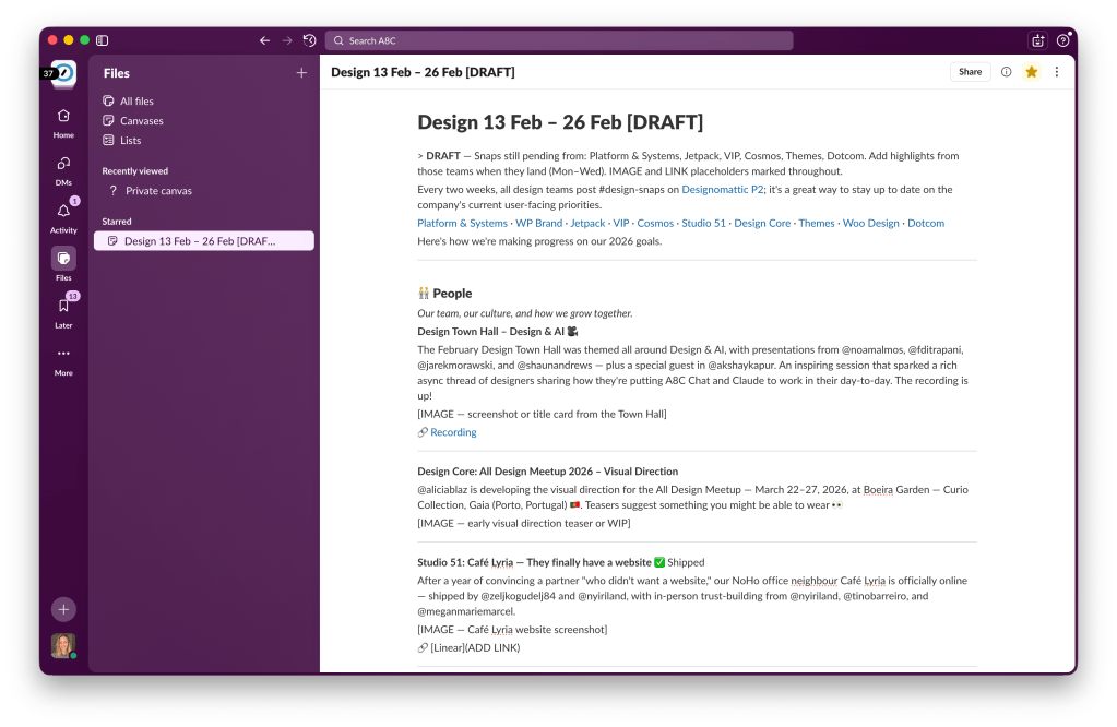 Every two weeks, we publish a post pulling highlights from across the design organisation, organised around four design goal areas: People, Process, Product, and Brand. It’s a meaningful piece of communication, but assembling it by hand means visiting each team’s update page, reading recent posts, selecting the right highlights, and formatting everything consistently. It takes real time.