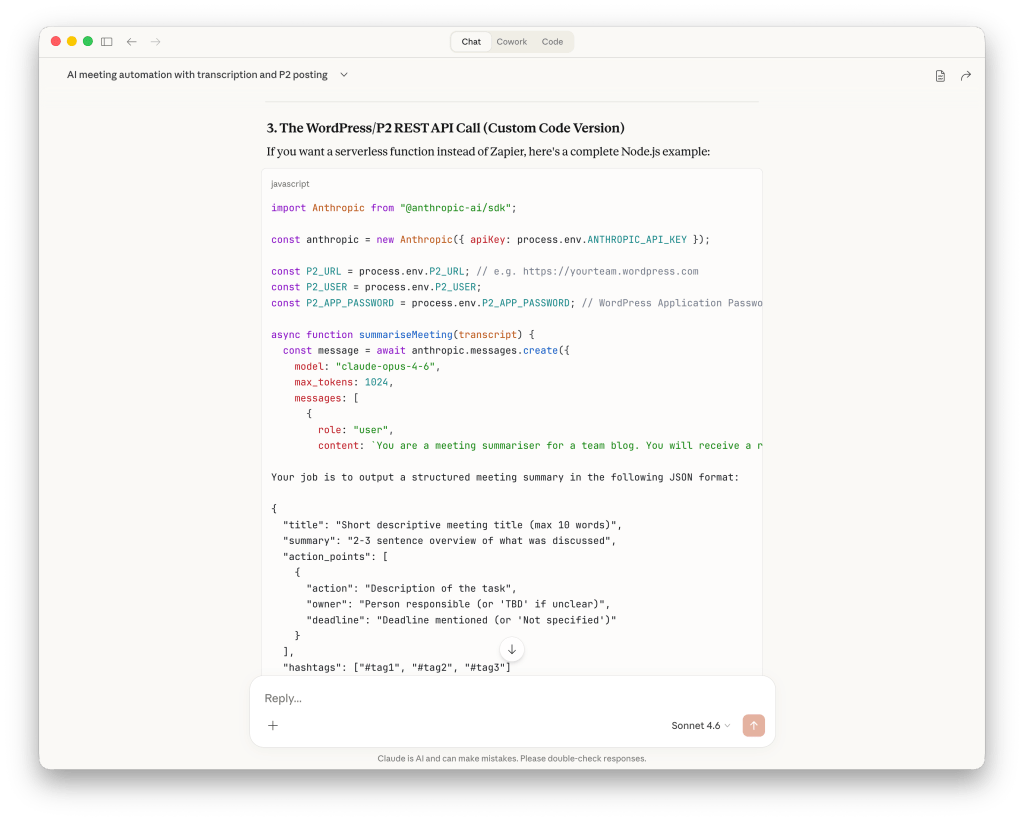 Fireflies.ai → Webhook + Script → Claude → Internal blog───────────── ───────────────── ──────────── ─────────────Bot joins meeting Fires on meeting Structures: Posts:Records + trans- end, passes • Summary • Video linkcribes everything transcript to • Action points • Summary(no manual Claude with owners • Action points record needed) + deadlines • Full transcript • Tags Tagged + ready